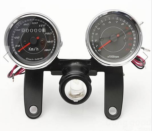 Description Voltage: 12V Fits for motorcycle Color: as picture shows Material: Stainless steel shell Tachometer measurement: 0-13000RPM Odometer measurement: 0-180km/h 2 in 1 speedometer gauge: Tachometer and Odometer Quantity: 1 pc Tachometer, 1 pc Odometer, 1 pc Bracket Internal night blue ,white and red LED light Size: Each Gauge Package size: 6/6.7 cm x 5.5 cm